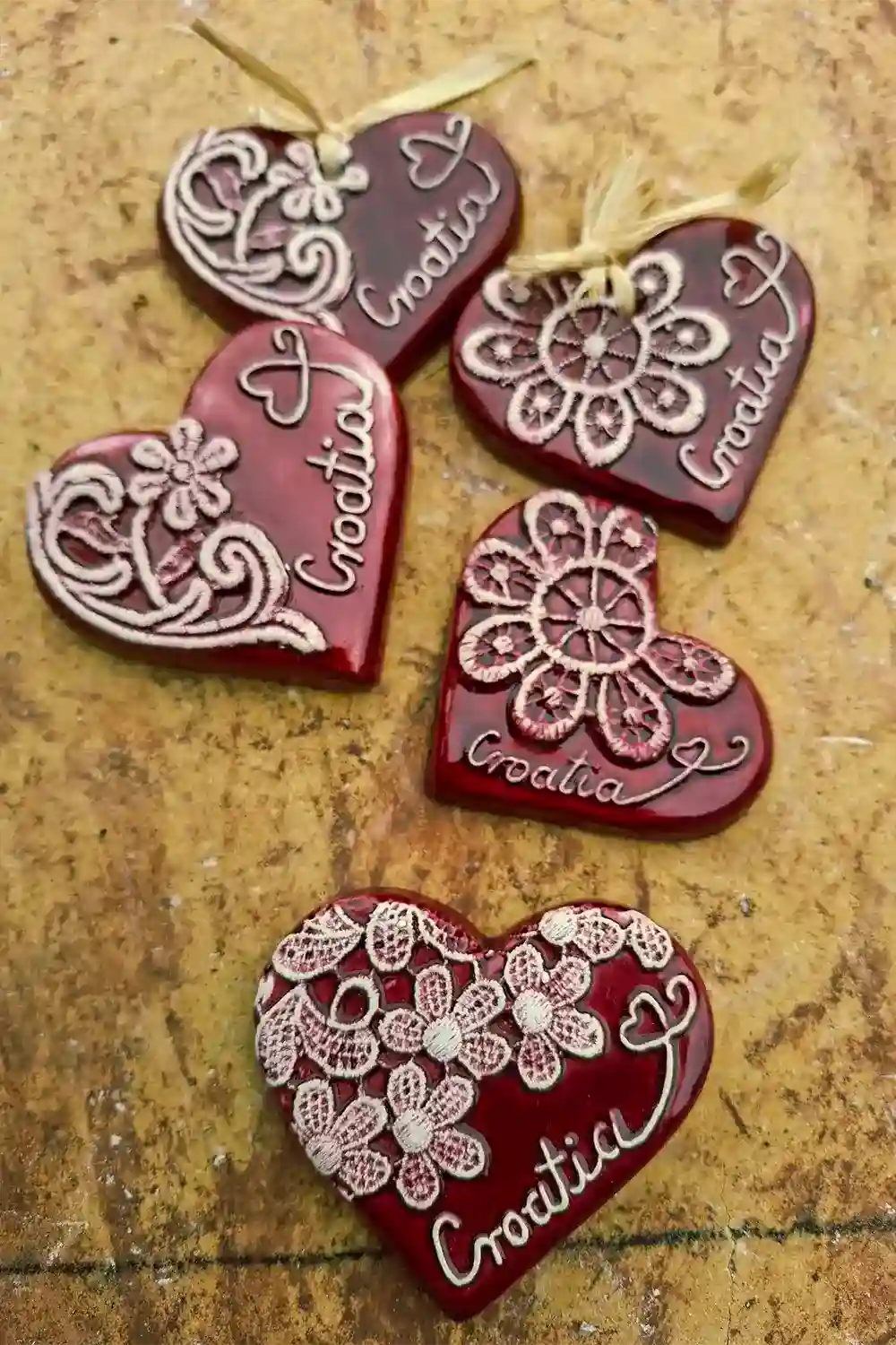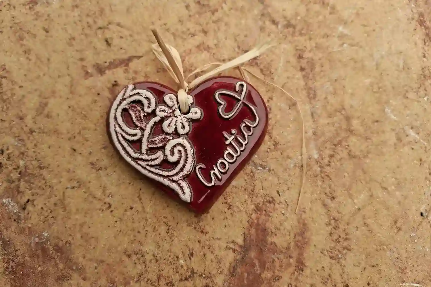 Unikatno srčeko oblikovano i ručno oslikano crvenom glazurom, šamotirana glina, slova plitki reljef.
